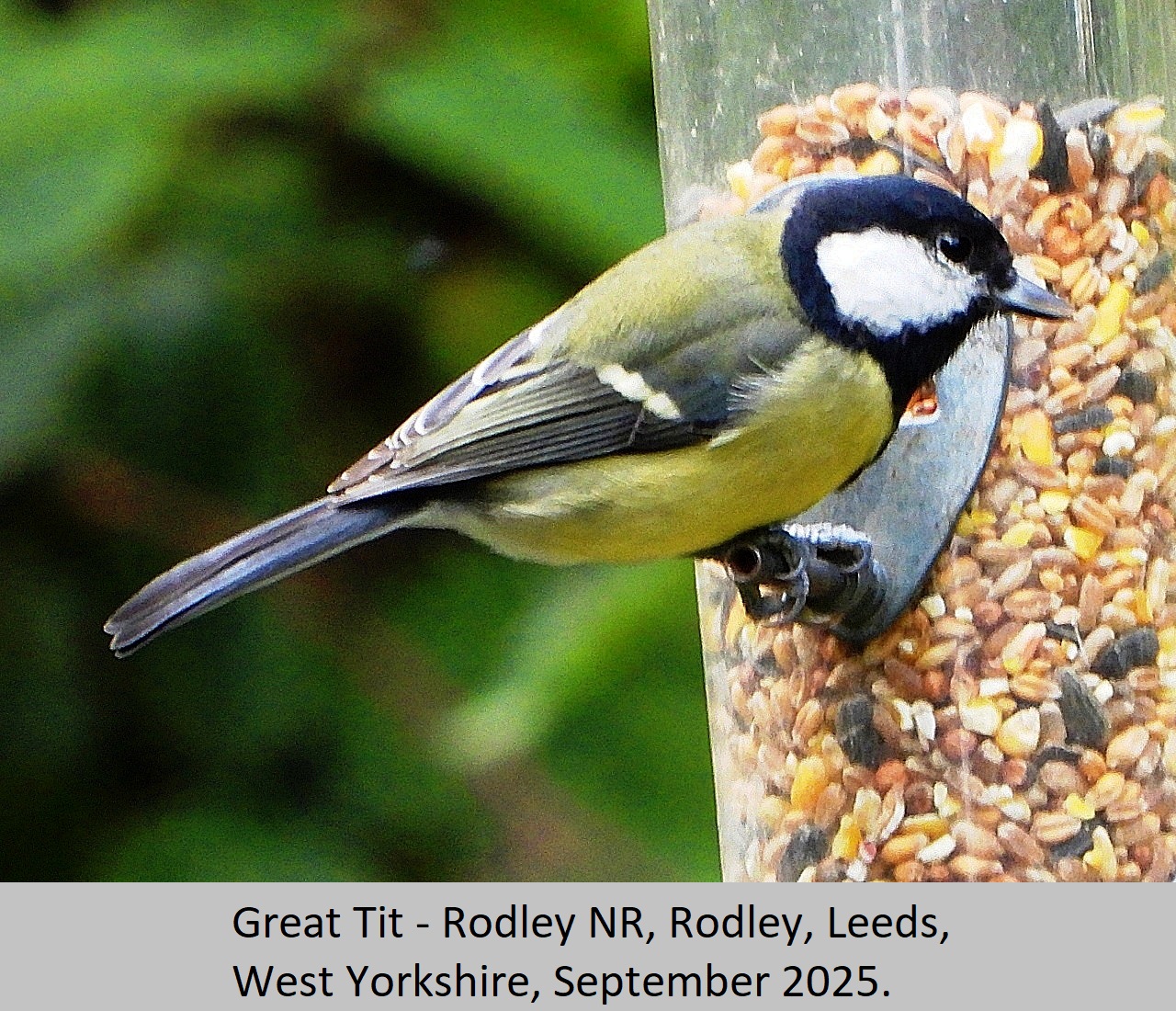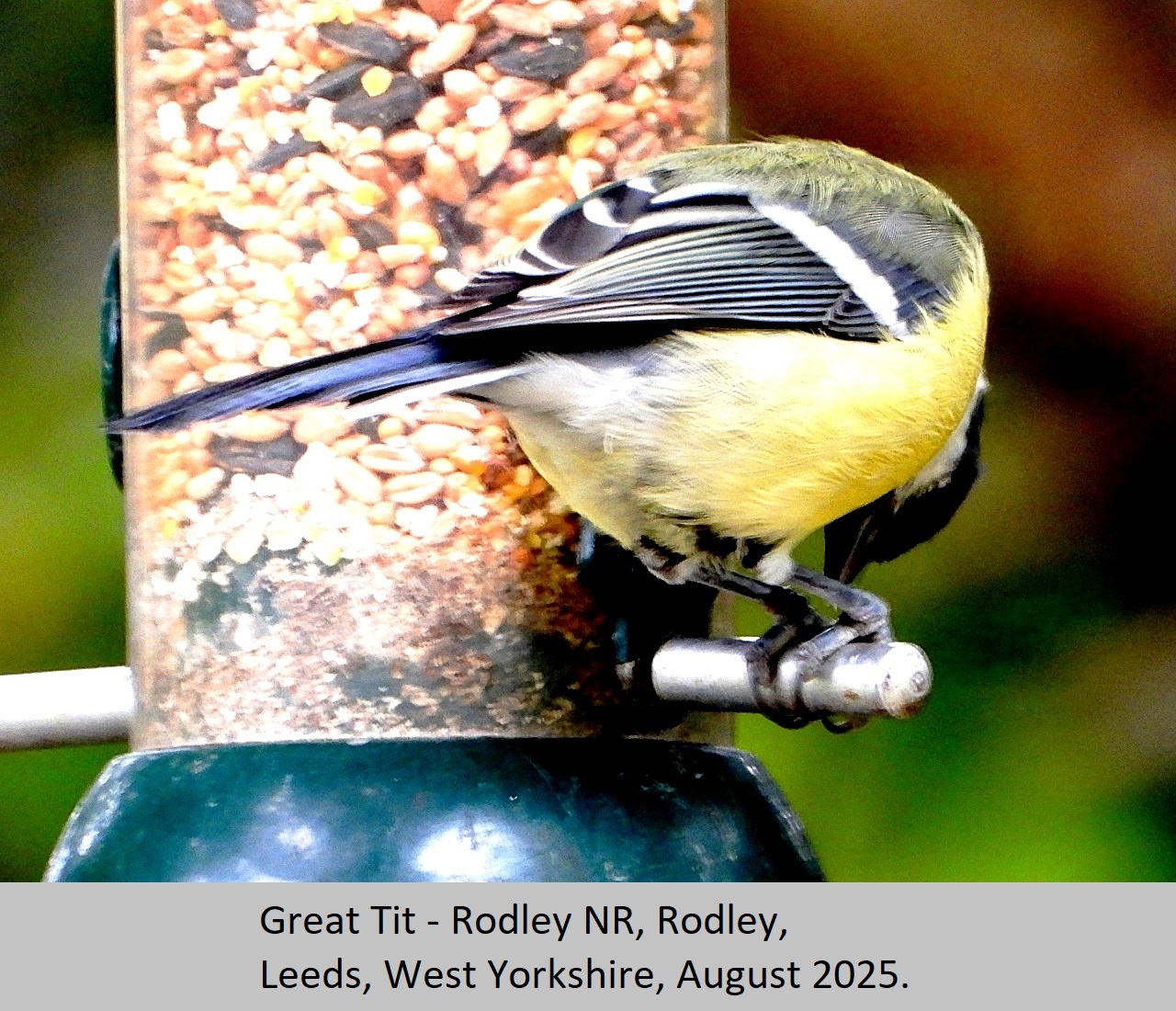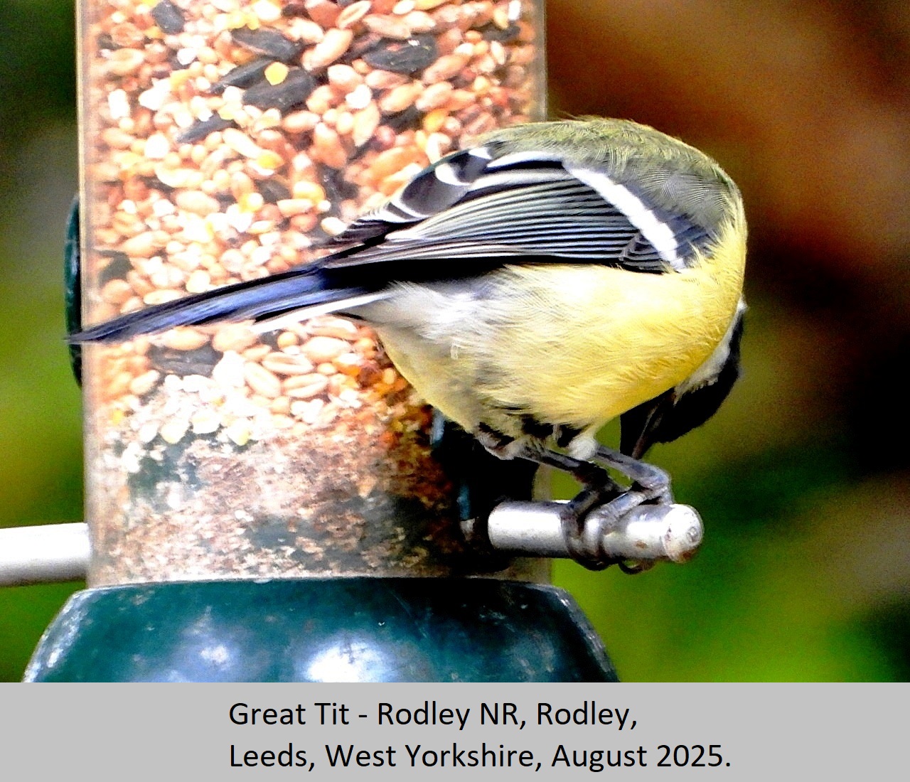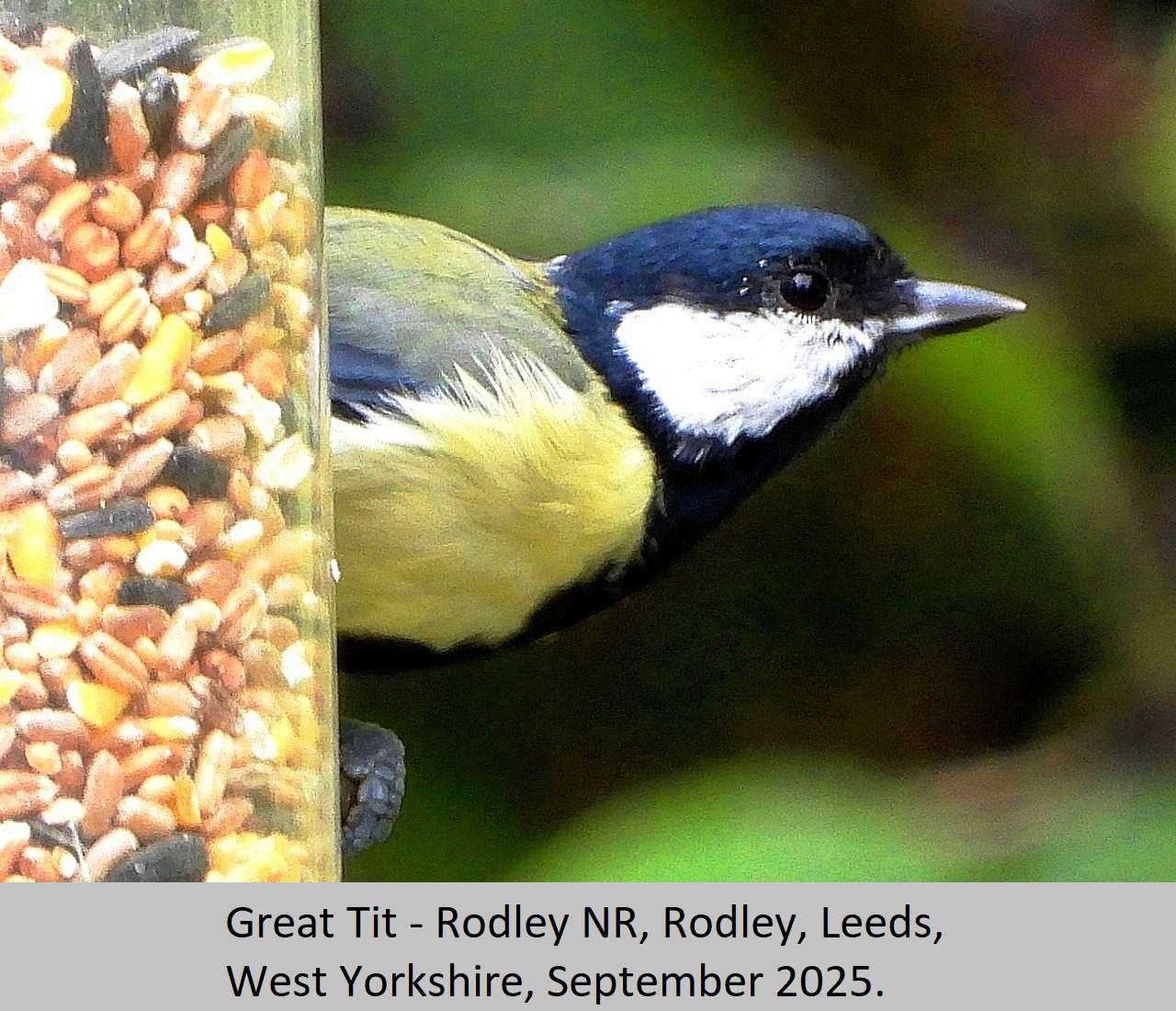 Great Tit: UK Status: Resident and native to the British Isles. Habitat: This can be found in parks, gardens, hedgerows and woodland, in fact any where with nesting cavities and a plentiful food supply. They eat insects and seeds. Breeding: Nests are made in tree hollows, gaps and cavities in walls, or rock faces, and nest boxes. The nests are from dried grasses and other plant materials, and are lined with moss, wool, hair and feathers. Females lay about twelve white eggs, spotted with reddish colour per brood, and there is usually two broods each year. Only the female incubates the eggs, both parents however raise their young. Comment: This delightful little bird is well know to humans, even those that live in the cities. Great Tits have adapted well to human habitation, and in fact often benefit from our gaps and cavities that we make in buildings. They often frequent gardens and parks to feast on food left out for them. Similar species are Coal, Marsh and Willow Tits. Similar Species: Coal Tit and Great Tit juveniles, and moulting adults of both species can be difficult to tell apart. However the adult Coal Tit birds are a little easier to identify if you know what to look for. Two of the main differences are they are smaller, and a similar size to Blue Tits. Great tits have a broad dark stripe running vertically from below the neck, down onto their under parts, Coal Tits lack this vertical stripe. Also the back of the Great Tit appears greenish in colouration, where as the back of a Coal Tit has a very greyish appearance.