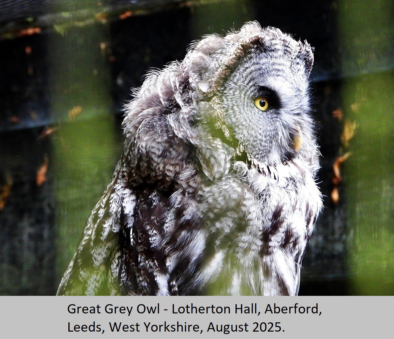 Great Grey Owl: UK Status: None resident, although this dapper looking owl inhabits places in all of the Northern hemisphere, the nearest to the UK it's found is Scandinavia in Northern Europe. Habitat: This owl tends to inhabit dense coniferous woods, whilst further south it appears to prefer dense Oak woodland, or mixed Oak woods.. Breeding: This bird does not build it's own nest, but takes over the old nests of other species such as crows and raptors. They will also nest on artificial platforms that are erected for them. Nesting and egg laying takes between March until May, depending on the local climate. Females lay about four large white coloured eggs, which hatch after about a month. When the chicks can fly the mother bird leaves them, and the male parent continues to raise into the autumn. By this time they have usually become proficient hunters. Comment: This bird was first discovered in Canada, but its now known that it inhabits many parts of the Northern Hemisphere, hot, or cold, It appears to be a very adaptable species.