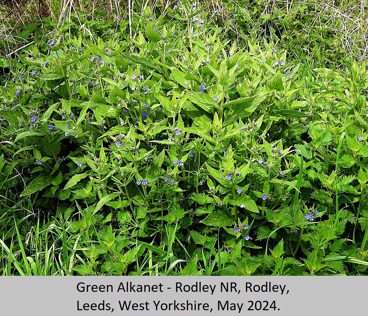Green Alkanet: UK Status: Resident and native. Flowering Period: From April through into July. . Appx Height: 30cm and up to 60cm. Habitat: This is a plant of damp and shady areas such as woodland, ditches and hedgerows. It is a member of the Forget-me-not family (Boraginaceae), and you can see the similarity in the flowers. Comment: This plant is fairly common and well distributed throughout England and Wales. It is absent in the Welsh mountains, and scarcer in Scotland, becoming scarcer the further north. It is absent from North Scotland, and the Scottish Isles. In Ireland it is only found in the north.